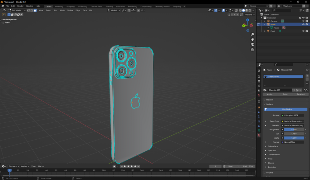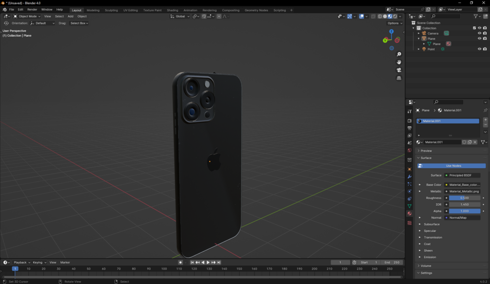 One Iphone 15 Pro in 3D, made using the Blender 3D, have Base, Metal map, Normal map and Roughness.
